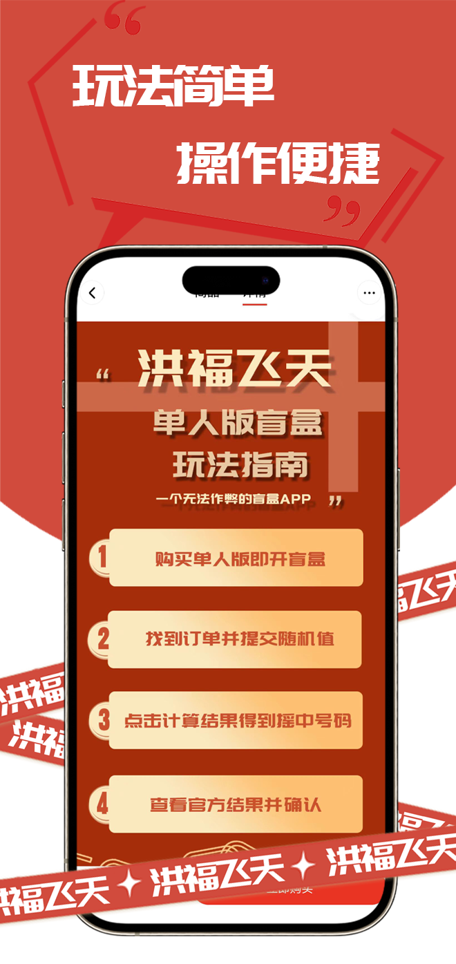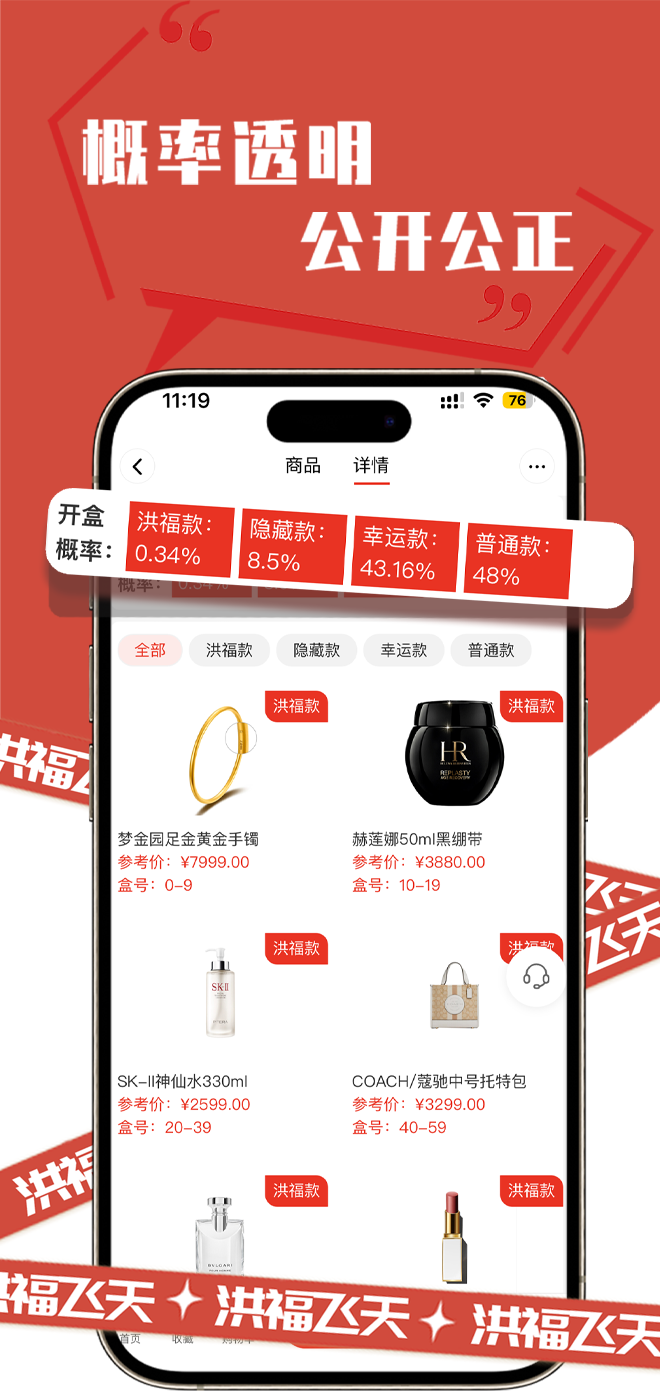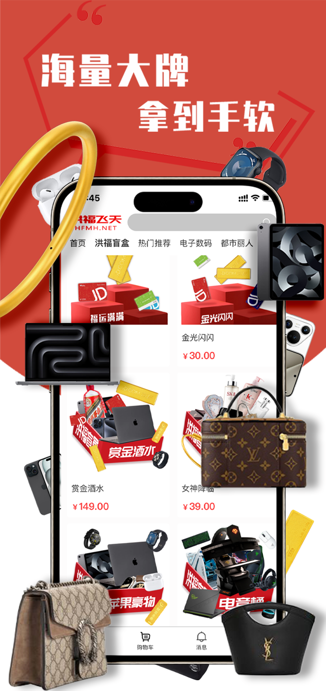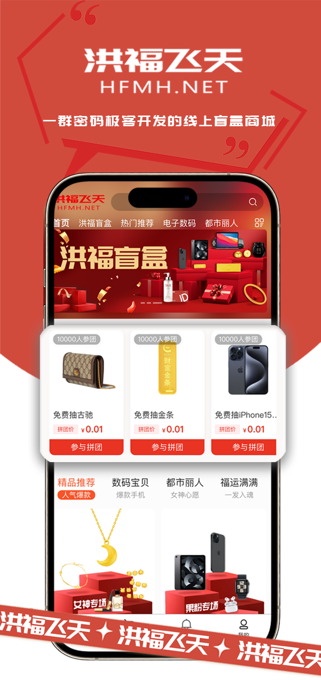洪福飞天APP是由一群密码极客开发出的一款任何人无法作弊的线上盲盒商城, 区块链为你的运气保驾护航,最新款苹果手机、正品LV包包、投资金条等洪福款大奖触手可及!